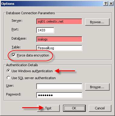 Select the ‘SQL Database’ option, then click on ‘Options’. Enter the FQDN for the database server, then enter the name of the database you created earlier. Since ISA firewall logging data is potentially sensitive, it is highly recommended that you select the option to ‘Force data encryption’. This will require that a valid server certificate be installed on your SQL server, however (for more information on how to configure SQL to use SSL, please read How to enable SSL encryption for an instance of SQL Server). Click on the ‘Test’ button and if everything is configured correctly, you should receive a message stating that the connection succeeded.