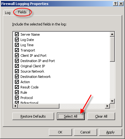 Once the test has been completed successfully, choose ‘Ok’, then click on the ‘Fields’ tab. At the bottom of the window, choose the option to ‘Select All’. This will ensure that all logging fields are recorded in the SQL database.