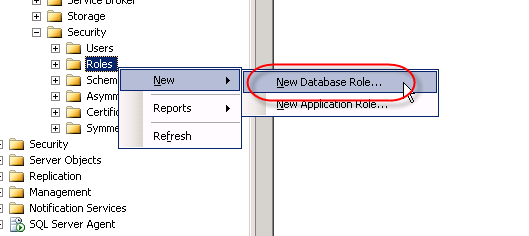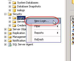 Now that we’ve created the login, we need to grant some additional privileges in order for the ISA firewall to successfully log data to the database. First we’ll begin by creating a new database role for our database. In the ‘Object Explorer’, expand the ‘isalogs’ database, then expand ‘Security’ and then ‘Roles’. Right-click on ‘Database Role’ and choose ‘New Database Role’.