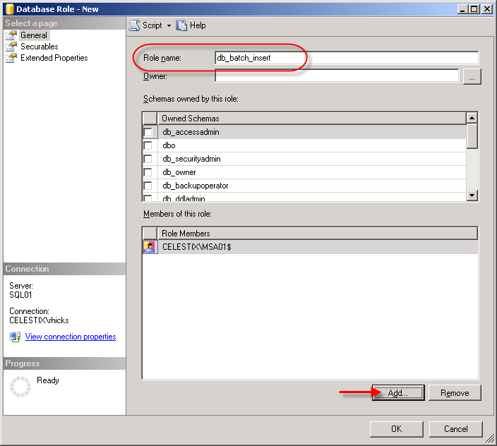 Call the new role name ‘db_batch_insert’, then add each of the ISA firewall logins you created earlier. Choose ‘Ok’ twice to complete.