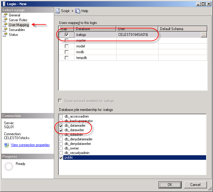 Select ‘User Mapping’, then select the checkbox next to the ‘isalogs’ database. Choose the ‘db_datareader’ and ‘db_datawriter’ database roles (‘public’ is checked by default) and then choose ‘Ok’.