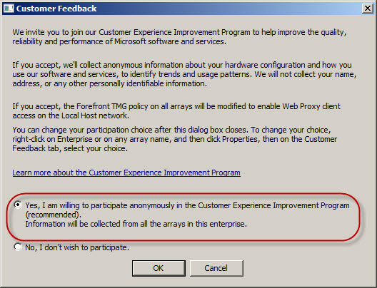 I would strongly encourage everyone to opt in to this program. Doing so will provide Microsoft with valuable information that will ultimately lead to a better product with more features. Microsoft will not be contacting you, nor will you receive unwanted e-mail or be asked to participating in any surveys. If you are concerned with information disclosure, please read the CEIP privacy statement.