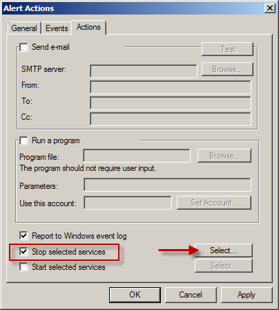 Select the Actions tab, and then check the Stop selected services option and choose Select…