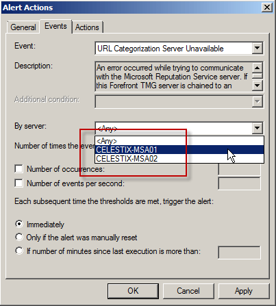 A better solution to enable a fail closed policy would be to configure the URL Categorization Server Unavailable alert to stop the TMG firewall service when triggered. To do this, open the TMG management console and highlight the monitoring node in the navigation tree.