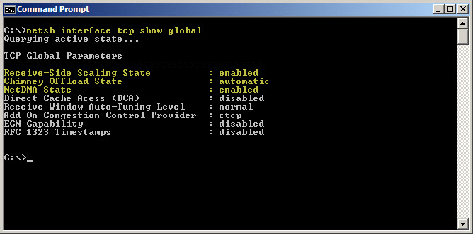 Today, the networking stack in Windows Server 2008 and Windows Server 2008 R2 both include the capabilities originally introduced with the SNP. Instead of modifying registry keys to enable/disable those features as we did in Windows Server 2003, they are now managed using netsh.exe. To view these parameters, enter the following command: