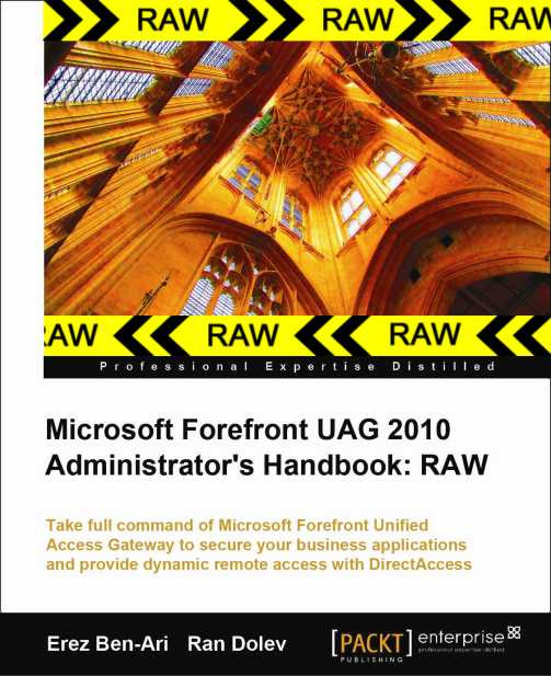 Great news! The Microsoft Forefront Unified Access Gateway (UAG) 2010 Administrator’s Handbook is now available for pre-order. Authored by Erez (Ben) Ben-Ari and Ran Dolev from Microsoft, this book will be a valuable asset for all UAG administrators. Due out early next year, the book is available in traditional print form or electronic book (eBook). You can purchase one or both, but if you buy the eBook you will have immediate access to the first three chapters, and additional chapters as they become available.