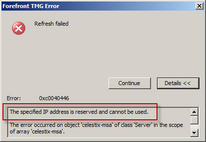 Recently the engineers at Celestix UK brought an interesting issue to my attention. They were working with a customer to configure TMG to protect an internal network using the address space 192.0.0.0/24. When attempting to assign an IP address from this network to the Internal network interface of the TMG firewall they would receive the following error:
