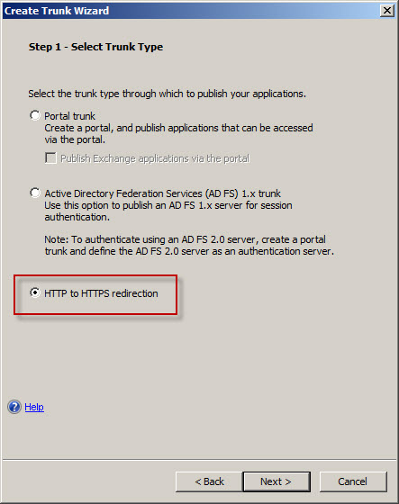 Configuring Forefront UAG to redirect HTTP to HTTPS is even simpler. After you’ve created a trunk and published OWA, right-click HTTP Connections in the UAG management console navigation tree, select New Trunk, and then select the HTTP to HTTPS redirection option.