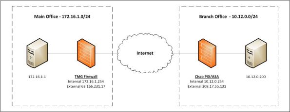 Forefront Threat Management Gateway (TMG) 2010 supports several protocols for establishing a site-to-site (LAN to LAN) VPN, including PPTP, L2TP, and IPsec. Of these, IPsec is the only supported protocol for establishing site-to-site VPN connections with third-party VPN devices such as Cisco PIX and ASA. In this post I will demonstrate how to configure Forefront TMG and the Cisco PIX/ASA to create a site-to-site VPN for the following branch office deployment scenario: