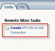 Open the TMG management console and highlight the Remote Access Policy (VPN) node in the navigation tree, then select the Remote Sites tab in the main window. In the Tasks pane on the right side, click Create VPN Site-to-Site Connection.