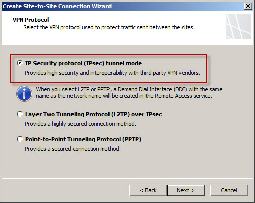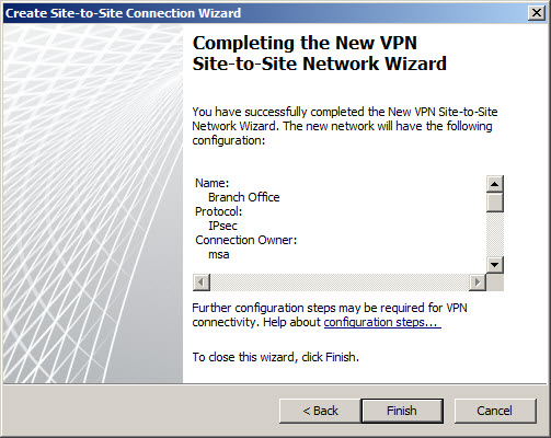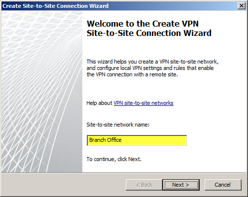The Site-to-Site Connection Wizard will collect the necessary information to establish the VPN tunnel. Enter a descriptive name when prompted.