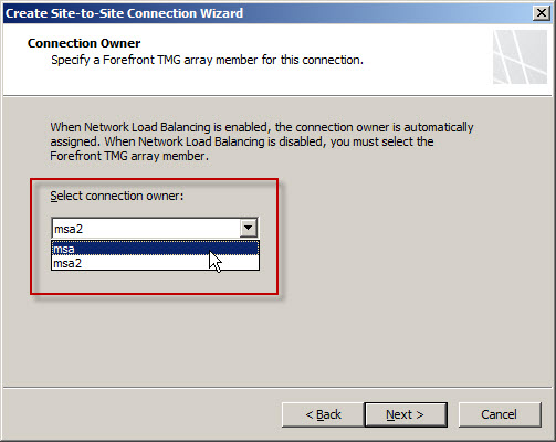 If the TMG firewall is a member of an array that does not have Network Load Balancing (NLB) enabled, select a node to be the connection owner. If NLB is enabled, the connection owner is assigned automatically. [Note: When configuring a site-to-site VPN connection on a TMG firewall that is a member of an array and NLB is not enabled, hosts that are accessed via the tunnel must be configured with a default gateway or static route that will direct traffic back to the array member chosen as the connection owner.]