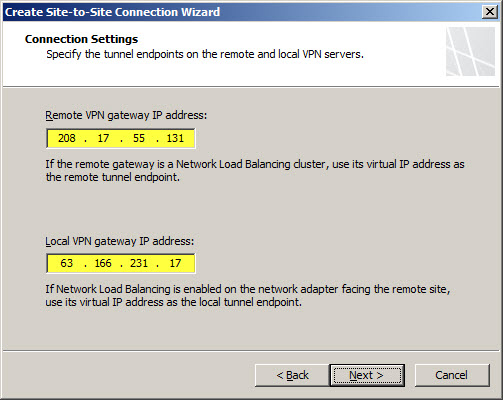 Enter the IP addresses of the remote and local VPN gateways. The remote VPN gateway IP address will be the IP address assigned to the outside network interface on the Cisco PIX/ASA firewall. The local VPN gateway IP address will be the IP address assigned to the External network interface on the TMG firewall. If the TMG firewall is part of an NLB-enabled array, specify the Virtual IP (VIP) address assigned to the External network of the array.