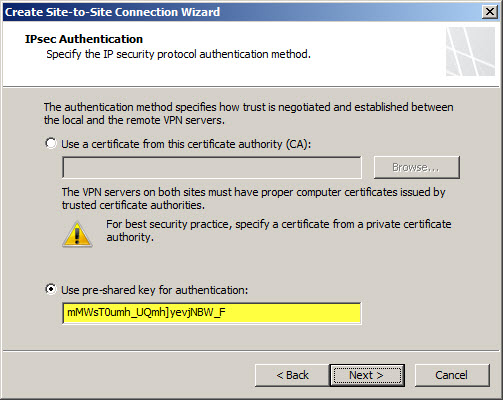 Certificates are the most secure and preferred method for authenticating tunnel endpoints, but because they are more complex and difficult to configure, many security administrators opt instead to use pre-shared keys. When choosing a key, be sure it is very long and complex (up to 128 characters – it is a good idea to use a random password generator for this task). Although using special characters is an excellent idea for complex keys, avoid using the question mark as the PIX and ASA object to this.