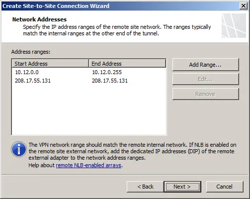 Add the address range(s) of the remote site network(s). It is recommended that these addresses be configured along subnet boundaries.
