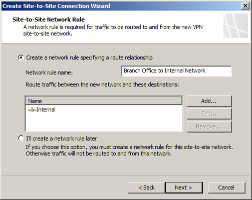 A network relationship needs to be established between the Internal network and the remote site network. The wizard automatically establishes a route relationship between these two networks.
