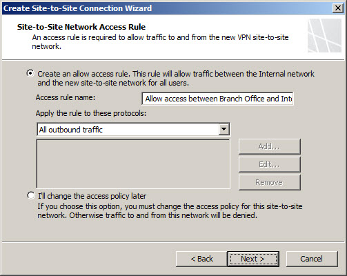 An access rule is required to allow communication between the Internal network and the remote site network. If this is a fully trusted remote network (e.g. branch office), select all outbound traffic. If the remote network is untrusted (e.g. business partner), specify which protocols and ports are allowed.