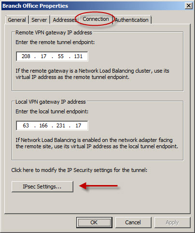 Do not apply the configuration now. The default encryption settings chosen by TMG are incompatible with the Cisco PIX and ASA. To change these settings to match the settings on the PIX/ASA, right-click the remote site and choose properties. Choose the Connection tab and then click IPsec Settings.