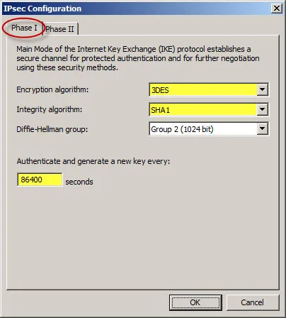 For the Phase I settings, change the Encryption algorithm to 3DES, the Integrity algorithm to SHA1, and the Authenticate and generate a new key every: to 86400 seconds (24 hours).
