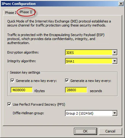 For the Phase II settings, change the Encryption algorithm to 3DES and the Integrity algorithm to SHA1. Change the Session key settings so that a new key is generated every 4608000 Kbytes or 28800 seconds (8 hours).