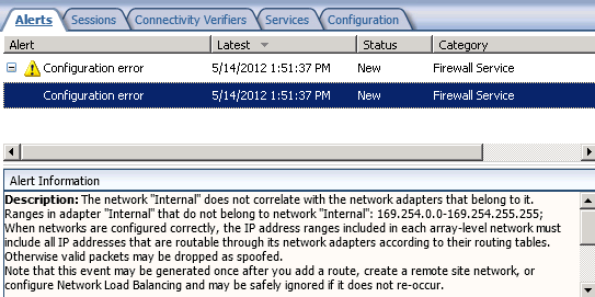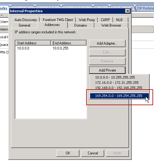 You can safely ignore this alert, or you can resolve the issue by adding the APIPA reserved network 169.254.0.0/16 to the Internal network definition. This can be accomplished by opening the Forefront TMG 2010 management console and highlighting the Networking node in the navigation tree, then right-clicking the Internal network, selecting the Addresses tab, then clicking the Add Private button and choosing the address range 169.254.0.0 – 169.254.255.255.
