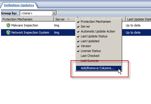 The Update Center in the Forefront TMG 2010 management console provides an instant view of the status of signature updates for the Malware Inspection and Network Inspection System (NIS) protection mechanisms. However, the column layout leaves out important information that can be essential when troubleshooting signature update issues. By default, the Last Checked and Last Success columns are hidden from view. To display these details, right-click anywhere in the column headings and then select Add/Remove Columns.