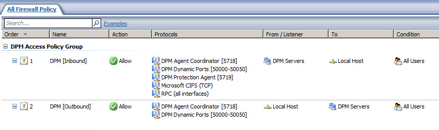 Create another access rule called DPM [Outbound]. The action will be allow and the protocols will include only DPM Agent Coordinator [5718] and DPM Dynamic Ports [50000-50050]. The source will be Local Host and the destination will be the DPM server for all users. Once complete the rule set should look like this: