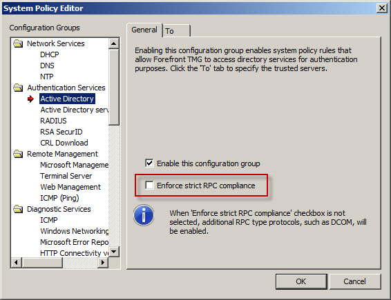 Next, right-click the Firewall Policy node in the TMG management console navigation tree and select All Tasks | System Policy | Edit System Policy. Under the Authentication Services configuration group highlight Active Directory. Select the General tab and uncheck the box next to Enforce strict RPC compliance.