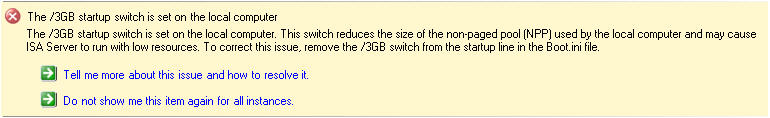 The /3GB boot.ini switch is perhaps the most misunderstood Windows tuning parameter there is. If you are not familiar with this switch, enabling it allows user mode processes to address 3GB of virtual memory instead of the usual 2GB. It does this at the expense of valuable kernel memory, however. The ISA firewall relies heavily on kernel memory (fweng.sys is the heart of the firewall core and runs in kernel mode) and cutting it in half can dramatically affect stability and performance by reducing the amount of available Paged and Non-paged Pool memory and reducing the maximum number of System Page Table Entries (PTEs). It has been well documented that the use of the /3GB boot.ini switch can cause serious issues, and in fact the ISA Best Practices Analyzer complains when it finds this switch in use.