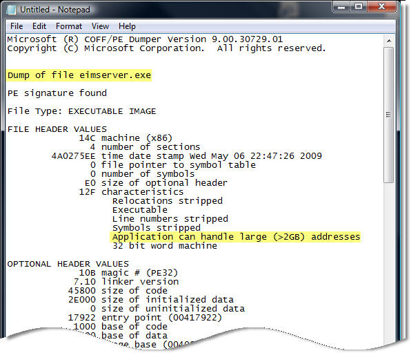 Applications must be configured to take advantage of this additional memory made available by the /3GB switch. You can verify which applications are configured in this manner by using the dumpbin.exe utility that is included with Microsoft Visual C++ and specifying the /HEADERS parameter. Websense has enabled this functionality for some of their core services, and by looking at the headers for eimserver.exe version 7.1.0.1154 we can see that this image does indeed support large address space.